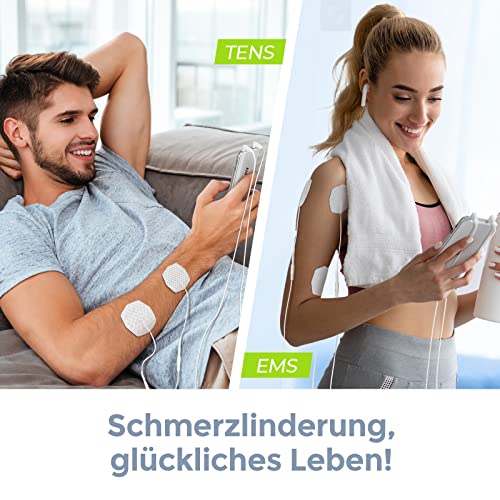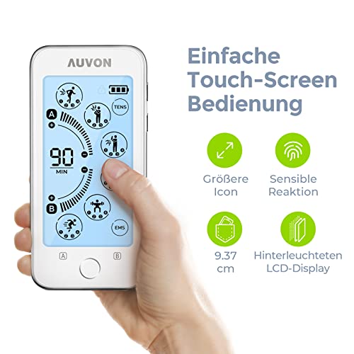 【Schmerzlinderung und Muskelentspannung】AUVON TENS Gerät kann dabei helfen, Schmerzen und Muskelkrämpfe zu lindern, beispielsweise im Nacken, Rücken sowie bei Arthritis und Sportverletzungen. EMS bewirkt durch elektrische Impulse eine Muskelkontraktion und aktiviert die Muskeln, um die Kraft und Ausdauer im Rahmen eines Krafttrainings zu steigern. • 【Einfache Bedienung】Der Touchscreen ermöglicht eine direkte Interaktion mit den Anzeigen auf dem TENS-Gerät. Durch das große Icons-Design ist das Gerät leicht zu bedienen. Sie können den AUVON Touch-Elektrostimulator sofort und ohne Lernaufwand verwenden. • 【Größere Batterie, doppelte Akkulaufzeit】Der elektrische Nervenstimulator verfügt über einen großen, wiederaufladbaren 300-mAh-Lithium-Akku, der bis zu 40 Stunden Standby-Zeit bietet – das doppelte von anderen TENS-Geräten mit 180 mAh, die auf 20 Stunden kommen. Keine Angst mehr vor einer Unterbrechung der Behandlung durch verbrauchte AA-Batterien. • 【2 separate Kanäle mit 24 Programmen】Der Muskelstimulationsapparat verfügt über 2 einzeln einstellbare Kanäle, sodass Sie ihn an zwei Körperbereichen mit unterschiedlicher Intensität verwenden können. Der neue Timer bietet eine flexible Zeiteinstellung von 10 bis 90 Minuten und einen Dauermodus für einen kontinuierlichen Gebrauch. • 【Im Lieferumfang enthalten】1 AUVON TENS-Gerät, 10 Elektrodenpads (8 Pads 5 cm x 5 cm, 2 Pads 5 cm x 10 cm), 2 Anschlusskabel, 1 USB-Kabel, 1 Padhalter, 1 Tragetasche, 1 mehrsprachige Bedienungsanleitung, unsere 24-Monate-Garantie und freundlicher Kundenservice.