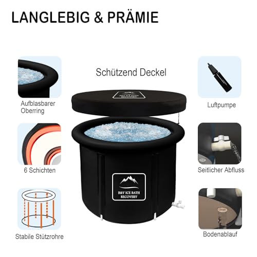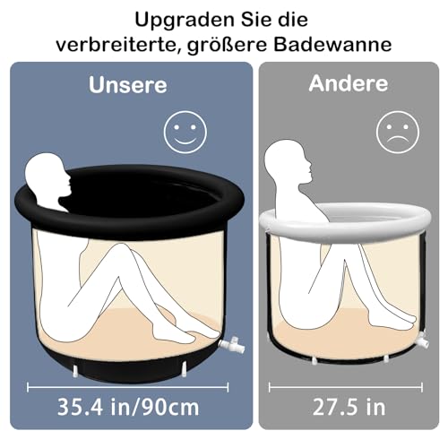Artikelgröße – 90cm φ 75cm H, tragbare Eisbadewanne bietet einen ausreichend großen Raum, perfekt für Erwachsene zum Eisbaden, entspannen und genießen Sie ein komfortables, erholsames Bad. Neben, Die Eisbad badewanne verfügt über eine Schutzhülle. Diese clevere Funktion hält das Wasser sauber und temperiert, insbesondere im Freien. Sparen Sie häufige Wasserwechsel und Heizkosten. Dies ist ein sehr effizientes Design. • EFFEKTIVES EISBAD – Eisbaden tonne für Sportler zur Linderung von Muskelverspannungen, zur Wiederherstellung von Entzündungen und zur Beschleunigung der Erholung nach dem Training. Die große 90cm faltbare badewanne bietet ausreichend Platz, sodass Sie bequem mit dem gesamten Körper eintauchen und das Eintauchen in kaltes Wasser und die Kaltwassertherapie erleben können. Faltbare eistonne bieten Sportlern und Fitnessbegeisterten eine schnelle und effektive Erholungslösung. • FALTBARE BADEWANNE – Die Kalttauchwanne besteht aus 6 Schichten verdickter Materialien, von denen 3 hervorragende Isolierschichten sind, sodass Sie ein belebendes Erlebnis bei der eisfass genießen können. Ermöglicht Ihnen, die Wassertemperatur in Eisbädern und Heißbädern länger aufrechtzuerhalten. Verstärkte Nähte, nicht leicht zu brechen, starke und stabile Halterung, die nicht kippt, oberer Luftring, Komfort und Freude. • AUFBLASBARE EISTONNE – Diese Eisbade wanne ist die ideale Lösung für Heimduschen und Eisbäder im Freien. Der obere Luftring ist mit einem Hochleistungsventil ausgestattet, das ein schnelles Aufpumpen in Sekundenschnelle über eine Handpumpe ermöglicht. Dieser Eiswassereimer verfügt über ein Doppelablaufdesign, das sauberes Wasser schnell abfließen lässt, dann zusammengeklappt und in einer Ecke platziert wird. Der gesamte Gebrauchs- und Aufbewahrungsvorgang ist effizient und einfach. • PAKET ENTHÄLT – Das Paket enthält badewanne, Abdeckung, Pumpe, Tasche, 6 x Stützrohre, Abflussrohr, Reparaturflicken und Handbuch. Eine tragbare aufblasbare Badewanne kann zum einfachen Tragen zusammengeklappt werden, sodass Sie das Spa-Erlebnis auf Campingplätzen oder in Hotels im Freien genießen können. Wir sind bestrebt, unseren Kunden das beste Erlebnis zu bieten. Sollten Sie auf Probleme stoßen, hinterlassen Sie uns bitte eine Nachricht.