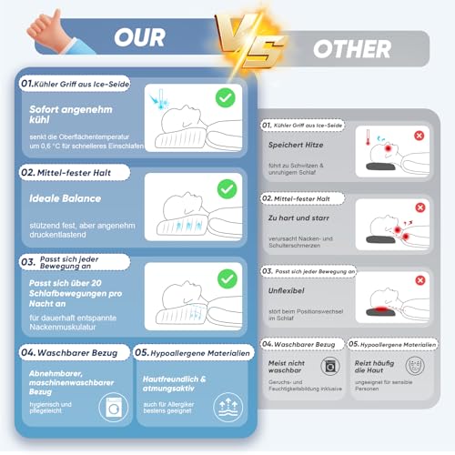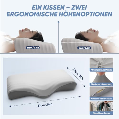 🔹 Ergonomisches & orthopädisches Design Dieses orthopädische Nackenkissen mit Memory Foam passt sich exakt der natürlichen Form von Kopf, Nacken und Schultern an. Die höhenverstellbare Konstruktion optimiert die Ausrichtung der Halswirbelsäule – egal ob Sie Rücken-, Seiten- oder Bauchschläfer sind. ✅ Unterstützung für den Nacken und verbesserte Schlafhaltung. • 🔹 Gedächtnisschaum mit Anti-Schnarch-Wirkung Unser hochwertiger Memory Foam sitzt weder zu hart noch zu weich – mit einer mittigen Mulde, die Atemwege offenhält und Schnarchen reduziert. ✅ Entspannung im Nackenbereich und ruhiger Schlaf. • 🔹 Zwei Höhenoptionen (11 cm & 9 cm) Wählen Sie zwischen 11 cm für Rücken‑ und Seitenschläfer oder 9 cm für Bauchschläfer. So finden Sie die ideale Unterstützung, abgestimmt auf Ihre Schlafposition und Schultern. ✅ Perfekte Höhenanpassung für maximalen Komfort jede Nacht. • 🔹 Premium Memory Foam – zertifiziert und temperaturausgleichend Der dicht strukturierte Memory Foam ist CertiPUR‑US und OEKO‑TEX zertifiziert – schadstofffrei, langlebig und atmungsaktiv. Er behält seine Form, vermeidet Durchsinken und bietet spürbar kühlen Schlafkomfort. ✅ Stabilität, Hygiene und Temperaturregulierung in einem. • 🔹 Kühlender Ice‑Silk Bezug Die hautfreundliche Ice‑Silk Hülle kühlt die Oberfläche um bis zu 0,6 °C ab und unterstützt damit tiefen, ungestörten Schlaf – ideal für wärmeempfindliche Schläfer. ✅ Kühleoberfläche für entspannten Schlaf – besonders in warmen Nächten. • 🔹 Warme Tipps & 100 % Zufriedenheitsgarantie Memory Foam kann beim Auspacken leicht riechen – das ist normal und verfliegt meist nach 3–5 Tagen Lüften. ✅ Nicht zufrieden? Unser deutschsprachiger Kundenservice hilft schnell und unkompliziert weiter – Ihr Wohlbefinden ist uns wichtig.