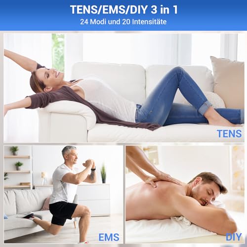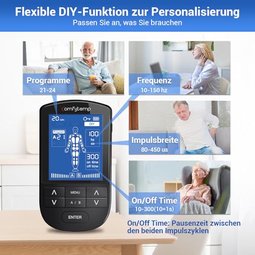 4 Ausgänge, 8 Elektroden, Ganzkörpereinsatz: Im Vergleich zu Zweikanal-TENS-Geräten bietet das Comfytemp 4-Kanal-Muskelstimulatorgerät eine breitere Palette an Schmerzlinderung. Das Pulsmassagegerät für Muskeln verfügt über 24 voreingestellte Modi (20 voreingestellte Modi + 4 anpassbare unbegrenzte Modi) und 20 Intensitäten mit einstellbarer Zeit (10 – 90 Minuten). Die Stimulationsmaschine ermöglicht den gleichzeitigen Einsatz von bis zu 8 Elektrodenpads. Der unabhängige A/B-Kanal kann in verschiedenen Modi und Intensitäten arbeiten. • Arzneimittelfreie & multifunktionale Schmerzlinderung: Das Comfytemp TENS/EMS-Gerät, ein Muskelstimulator, kombiniert TENS- und EMS-Therapien. Es ist ein großes Gerät, das Sie zu Hause für die Schmerzbehandlung verwenden können. Professionelle Schmerzlinderungsprodukte bieten punktgenaue und dauerhafte Muskelschmerzlinderung bei Rückenschmerzen, Menstruationsbeschwerden, Tennisellenbogen, Karpaltunnelsyndrom, Arthritis sowie Schmerzen in Schulter, Knie, Bein und Fuß. • Unbegrenzter DIY-Modus: Das TENS/EMS-Gerät bietet 4 voreingestellte Modi im DIY-Modus. Sie können die Puls-Einstellung nach Ihren Wünschen anpassen, indem Sie die Frequenz, Pulsbreite und Puls-Ein-/Aus-Zeit anpassen. Erleichtern Sie Muskelschmerzen und fördern Sie die Muskelleistung auf die Art und Weise, die für Sie am bequemsten ist. Mit Speicherfunktion. Bei jedem Einschalten kann der letzte Modus direkt verwendet werden. • Hochwertige Elektroden Pads: Das Pad ist aus PET-Material und branchenführendem Klebstoff hergestellt und bietet eine hervorragende Selbstklebeleistung. Es ist ausgestattet mit einem Rückenclip für Portabilität und einem druckempfindlichen Klebeband, um das Problem der Nicht-Passform an der Haut zu lösen. Der Muskelstimulator und das Zubehör mit 10 Stück Ersatzpads in 3 Größen bieten eine Aufbewahrungstasche, um die Lagerung zu erleichtern. • Sorgloser Kundendienst :Wir kümmern uns um jedermanns Erfahrung und übernehmen die Verantwortung für alle unsere Produkte. Wenn es irgendein Problem mit dem Produkt gibt, kontaktieren Sie uns bitte rechtzeitig. Wir werden Sie mit einer zufriedenstellenden Lösung innerhalb von 24 Stunden zur Verfügung stellen.