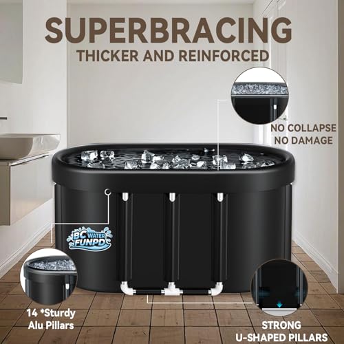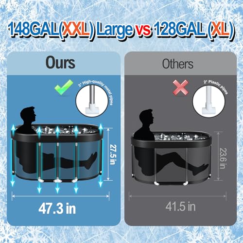 【Geräumiges Oval-Design für alle Körpergrößen】Perfekt ausgestreckt entspannen! Unser 120x70x70 cm Eisbadetonne (Volumen: 450 Liter*) bietet mit ovaler Form mehr Beinfreiheit als runde Modelle – ideal für Sportler, Großgewachsene und entspannende Ganzkörper-Kältetherapie • 【8-fach verstärkt & absolut wetterfest】Robuste UV-resistente Nylon-Wände + 8 Stahl-Stützen (30% stabiler als 6-Bein-Modelle!) halten selbst bei Sturm. Outdoor-taugliches Badefass für Garten, Terrasse oder Camping – mit isoliertem Deckel gegen Regen/Sonne • 【Sofortige Regeneration – wissenschaftlich belegt】Reduziert Muskelkater um bis zu 47% (Studie: Universität Oslo). Kältebecken gegen Entzündungen, stärkt Immunsystem* und steigert Energie – perfekt nach Workout, Sauna oder Bürostress • 【Blitzaufbau & platzsparend】In 3 Minuten startklar! Klappbare Badewanne wiegt nur 4,1 kg, passt in den mitgelieferten Tragebeutel (ideal für Gym, Reisen oder Kellerlagerung) • 【6-Schicht-Isolierung hält Eis 4h kalt】Thermo-isoliertes Kältebecken mit 5 Speziallagen (inkl. Perlwatte & wasserdichter Beschichtung) halten die Temperatur bis von -30°C bis +60°C stabil. Kein ständiges Nachkühlen – mehr Zeit für Regeneration