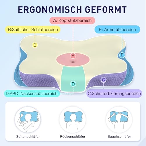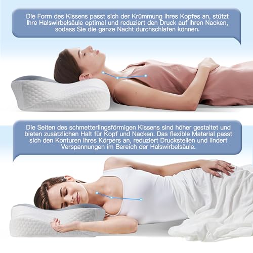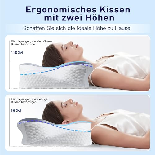 【GUTER SCHLAF BEGINNT MIT EINEM GUTEN KISSEN】Wachen Sie immer mit Nackenverspannungen oder Rückenschmerzen auf? Unser bewährtes, ergonomisch geformtes Memory-Schaum-Kissen stützt Ihren Kopf, Nacken, Schultern und Rücken perfekt. Durch das innovative Design passt sich unser Kissen ganz natürlich an Ihre Wirbelsäulenform an, stützt die Wirbelsäule optimal und ermöglicht Ihnen einen bequemen Positionswechsel. So wachen Sie entspannt auf und starten voller Energie in den Tag. • 【Doppelte Höhe】Wenn Sie noch immer auf der Suche nach einem Kissen mit der richtigen Höhe sind, ist unser Nackenkissen genau das Richtige für Sie. Es hat zwei Seiten mit unterschiedlichen Höhen (niedrige Seite: 9 cm, hohe Seite: 13 cm), sodass Sie die für Ihre Schlafposition am besten geeignete Höhe wählen können. Darüber hinaus verfügt das Kissen über spezielle Aussparungen an beiden Seiten, in denen Sie Ihre Arme bequem ablegen können, um einen angenehmen Schlaf zu gewährleisten.Das gesamte Kissen hat eine Größe von 60 x 36 x 13/9 cm, sodass Ihr Kopf auch beim Drehen im Schlaf ruhig auf dem Kissen liegen bleibt. • [Hautfreundlicher, atmungsaktiver Kissenbezug aus Eis-Seide] Im Gegensatz zu anderen Memory-Schaum-Kissen, die normalerweise mit Eis-Seide bezogen sind, verfügt dieses Kopfkissen über einen hochwertigeren, hautfreundlichen Kissenbezug aus Eis-Seidenstoff, der sich weich anfühlt, sich perfekt an die Haut anschmiegt, Wärme ableitet und für eine gute Luftzirkulation sorgt. So bleiben Sie nachts kühl und frisch.Für einen gesunden und komfortablen Schlaf! Der Bezug ist abnehmbar, mit einem Reißverschluss versehen und maschinenwaschbar. • 【LANGSAM RÜCKSPRINGENDER HOCHWERTIGER MEMORY-SCHAUM】Das Nackenkissen besteht aus hochwertigem, CertiPUR-US-zertifiziertem Memory-Schaum mit Rückpralleffekt. Die erstklassige Qualität ist fest und nicht zu weich, sodass Ihr Kopf, Nacken, Schultern und Rückenmuskulatur beim Liegen auf dem Rücken oder auf der Seite maximalen Komfort und Entspannung genießen. Wenn Sie das Memory-Schaum-Kissen zum ersten Mal verwenden, sollten Sie es auspacken und mindestens 24 Stunden lang liegen lassen. Nachdem der Kissen Kern vollständig zurückfedert und seine Stützkraft wiederhergestellt ist, sorgt es für einen besseren Schlaf. • 【Der Retter für Ihren Schlaf, wirklich wirksam】Wählen Sie ein hochwertiges Nackenkissen und Sie werden feststellen, dass sich Ihre Schlafqualität überraschend verbessert. Unsere Kissen haben sich über viele Jahre auf dem Markt bewährt und haben bereits vielen Menschen zu einem angenehmen Schlaf verholfen. Wenn Sie auf der Suche nach einem besser geeigneten Kissen sind, probieren Sie doch einmal unsere Produkte aus. • Hinweis: Memory-Schaum-Kissen können nach dem Transport in einer heißen, luftdichten Umgebung einen leichten Geruch aufweisen. Dies ist normal. Bitte legen Sie das Kissen nach Erhalt für 3–5 Tage an einen kühlen, gut belüfteten Ort. Bitte beachten Sie, dass der Komfort individuell unterschiedlich ist und von Faktoren wie Körperform, Schlafposition und Nackenform beeinflusst werden kann. Wenn Sie mit unserem Kissen nicht zufrieden sind, können Sie sich jederzeit an uns wenden. Wir legen großen Wert auf Produktqualität und verpflichten uns, hochwertige Produkte und einen hervorragenden Kundenservice zu bieten.