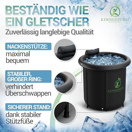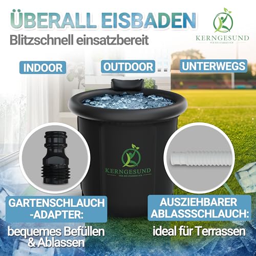Kraft des Eisbaden: Erlebe die Power vom Eisbaden – Stärkt das Immunsystem, verbessert Durchblutung & fördert schnelle Regeneration. Fühle dich erfrischt und starte energiegeladen in den Tag. • Perfekte Isolierung : speichert Kälte besonders lang dank 5-fach isoliertem Eisbad, 3-fach isoliertem Deckel und 5-fach isolierter Abdeckung. Super lange kaltes Wasser für dein Badefass. • Einzigartiger Komfort: inkl. integrierter Nackenstütze und extra dickem und robustem aufblasbarem Ring – verhindert Überschwappen von Wasser aus dem Eisbad. Patentiertes Design der Eiswanne. • Leichtes Befüllen & Entleeren: Gartenschlauchadapter für extra leichtes Befüllen & Entleeren der Eistonne für zuhause oder unterwegs. Perfekt für das Entleeren des Eisfass auf lange Distanz. • Einfacher Transport: 100% auslaufsicherer Drybag – mit der wasserdichten Tragetasche das faltbare Eisbad trocken und perfekt geschützt transportieren. Optimal um die Eisbaden Tonne zu verstauen.