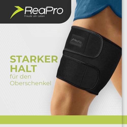 ReaPro Oberschenkelbandage, Verstellbare Oberschenkelstütze für Damen & Männer mit 2 Klettverschlüssen I Oberschenkel Kompression Bandage Kompressionsmanschette, Rutschfest für links oder rechts