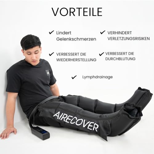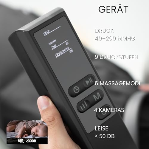 Breiter Druckbereich & Individuell einstellbare Massage Genieße eine vollständig personalisierte Massage mit 9 Intensitätsstufen (40–200 mmHg). Wähle zwischen sanfter Entspannung für den Alltag oder einer tiefen Druckmassage zur Regeneration nach dem Training – perfekt für jede Situation. • Fortschrittliche Technologie mit 6 Modi & 4 Luftkammern Das 4-Kammer-System sorgt für eine gleichmäßige, umlaufende Kompressionsmassage. Mit 6 intelligenten Programmen zur Förderung der Blutzirkulation, Entlastung müder Beine, Lymphdrainage und Straffung – für ein wohltuendes Gefühl wie im Spa. • Schnelle Regeneration & Aufwärmen vor dem Sport Ideal für Sportler: Unterstützt den Abbau von Milchsäure, reduziert Muskelverspannungen und beugt Verletzungen vor. Perfekt zum Aufwärmen vor dem Training oder zur Erholung danach. • Ganzheitliches Wohlbefinden für Zuhause Nicht nur für Sportler! Lindert schwere Beine, Wassereinlagerungen, Krampfadern und Lymphödeme. Fördert den Lymphfluss, verbessert die Durchblutung und kann Cellulite sichtbar reduzieren – für mehr Leichtigkeit im Alltag. • Kompakt, tragbar & ideales Geschenk Leichtes, geräuscharmes Design mit praktischer Tragetasche – ideal für den Einsatz zu Hause, im Büro oder auf Reisen. Ein durchdachtes Geschenk für Sportbegeisterte, Senioren oder alle, die sich mehr Entspannung wünschen.