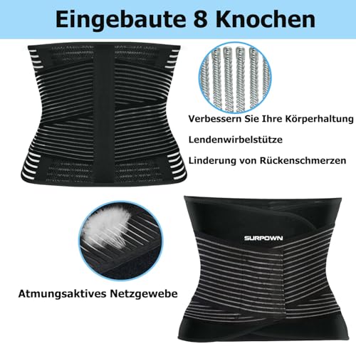 SOFORTIGE LINDERUNG DER RÜCKENSCHMERZEN: SURPOWN-Rückengurt verfügt über zwei Einstellgurte für eine individuelle Passform und Kompression. Ihre Schmerzen werden sofort gelindert. Hilft bei Schmerzen im unteren Rücken, Skoliose, Bandscheibenvorfall, Ischias Beschwerden und Muskelschmerzen. • Starke Unterstützung für den Rücken: Der SURPOWN-Rückengürtel besteht aus 8 verstärkten Acrylknochen, die den unteren Rücken ausreichend stützen. Er ist wie ein Kompressionsgürtel, der den Lendenbereich stützt. Entlastet bei Ischias, Bandscheibenvorfall, Skoliose, Rückenschmerzen • BEWEGUNGSFREIHEIT: Die SURPOWN-Rückenstütze ist die beste Option für eine bequeme Lendenwirbelstütze, die Ihnen dennoch volle Bewegungsfreiheit bietet. Ob Sie nun schwer heben, im Fitnessstudio trainieren, Auto fahren oder einfach nur Hausarbeit machen, unsere Rückenstützgürtel ist für alles ideal. So können Sie sicher sein, dass Sie Ihren Rücken sanft bewegen können. • LEICHT, ATMUNGSAKTIV UND PFLEGELEICHT: Die SURPOWN-Rückenbandage ist aus dehnbarem Neopren-Polyesterfasermaterial hergestellt. Das von uns verwendete Mesh-Material gibt überschüssige Wärme und Feuchtigkeit ab, damit Sie sich nicht eingeengt und eingezwängt fühlen. • BESTE UNTERSTÜTZUNG FÜR DEN RÜCKEN: SURPOWN Rückenbandage -Nierengurt verfügt über acht feste Stützstreben, die alles an Ort und Stelle halten. Sie erhalten Unterstützung genau dort, wo Sie sie am dringendsten benötigen. Ihr unterer Rücken oder die Lendenwirbelsäule werden entlastet. Die Stützen liegen eng an Ihrem Rücken an, aber ohne unnötigen Druck zu verursachen.