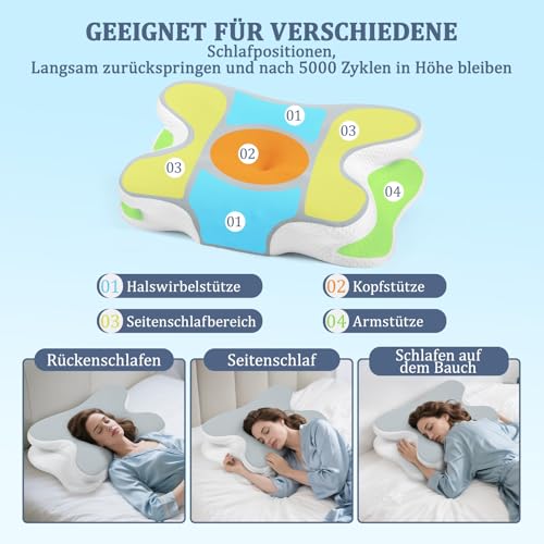 Nackenkissen für weniger Nackenschmerzen & besseren Schlaf: Wachen Sie oft mit Nackenschmerzen auf oder leiden unter Schlaflosigkeit? Unser zervikales Konturdesign wurde speziell entwickelt, um sich den natürlichen Konturen von Kopf, Nacken und Schultern anzupassen. Dieses Memory Foam Kissen bietet optimalen Halt und lindert Beschwerden, damit Sie einen erholsamen Schlaf genießen können. Das ideale Schlafkissen für alle, die unter Nacken- oder Kopfschmerzen leiden. • Bleiben Sie die ganze Nacht kühl & komfortabel: Das kühlende Kopfkissen mit atmungsaktivem, abnehmbarem Eisseiden-Kissenbezug sorgt für angenehme Frische die ganze Nacht. Das ergonomische Design unterstützt Nacken und Wirbelsäule, während der hochwertige Schaumstoff perfekt für Nackenstützkissens- und Rückenschläfer ist. Dieses praktische, luxuriöse Nackenkissen-Kopfkissen ist ein ideales Geschenk – ob zu Weihnachten oder anderen Anlässen, für Familie, Freunde oder für Sie selbst. • Individuelle Unterstützung für jeden Schläfer:Unser ergonomisches Kopfkissen mit Konturdesign und zwei Höheneinstellungen bietet personalisierten Komfort. Egal, ob Sie auf der Seite, dem Rücken oder dem Bauch schlafen, dieses orthopädische Kissen hält Ihre Wirbelsäule in der richtigen Position und entspannt Ihre Muskeln. Ein unverzichtbares Schlafkissen, das für jede Schlafposition geeignet ist. Unsere Produkte haben die Zertifizierungen CERTIPUR US und OEKO Approved. Unsere Produkte haben die Zertifizierungen CERTIPUR US und OEKO Approved. • Hochwertiger Memory Foam mit 5S Rückstellung:Hergestellt aus hochwertigem, hautfreundlichem Memory Foam, bleibt dieses Nackenstützkissen das ganze Jahr über in Form. Die 5S Langsamrückstelltechnologie sorgt dafür, dass das Kopfkissen Nackenschmerzen sanft Ihre Konturen umschließt und eine gleichmäßige Unterstützung bietet – für ein luxuriöses Schlaferlebnis jede Nacht. • Durchdachte Verpackung & Pflege: Unser orthopädisches Kissen wird mit einem hochwertigen Memory-Foam-Kern und einem kühlenden Eisseiden-Kissenbezug geliefert. Der Schaumstoff kann anfangs einen leichten Geruch haben, der bei Belüftung innerhalb von 3-5 Tagen verschwindet. Mit Sorgfalt entworfen, ist dieses Nackenkissen Kopfkissen bereit, Ihre Schlafroutine ab dem Moment seiner Ankunft zu transformieren.