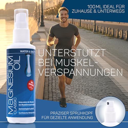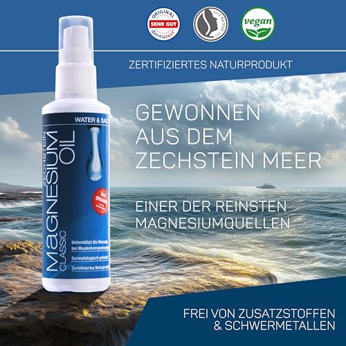Water & Salt® 100ml Classic Magnesiumöl Zechstein Magnesiumspray [DERMATOLOGISCH GETESTET] – Magnesium Öl Magnesiumspray – Zertifiziertes Naturprodukt – Magnesium Oil frei von Zusatzstoffen